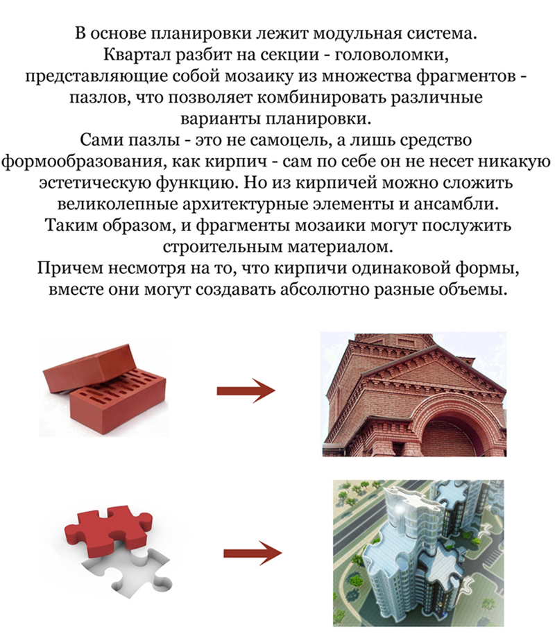 В основе планировки лежит модульная система. Квартал разбит на секции - головоломки, представляющие собой мозаику из множества фрагментов, пазлов, что позволяет комбинировать различные варианты планировки.