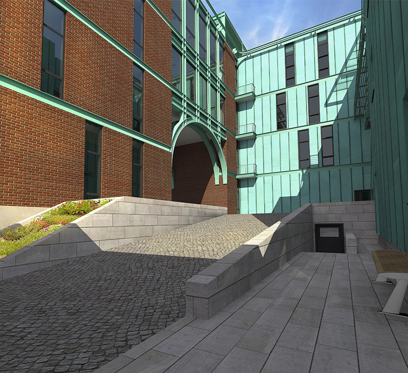 В отделке фасадов комплекса предусмотрено классическое сочетание натуральных отделочных материалов - красный «состаренный» кирпич и патинированная медь.